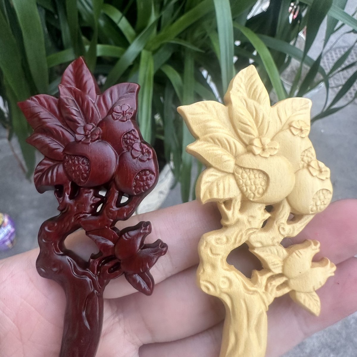 Natural Rosewood Hair Stick Set - 20cm U Shape Pomegranate Design Hairpin (石榴单簪)