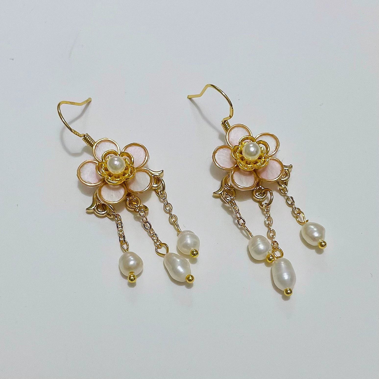 - Each earring features one five-petaled plum blossom with freshwater pearl center