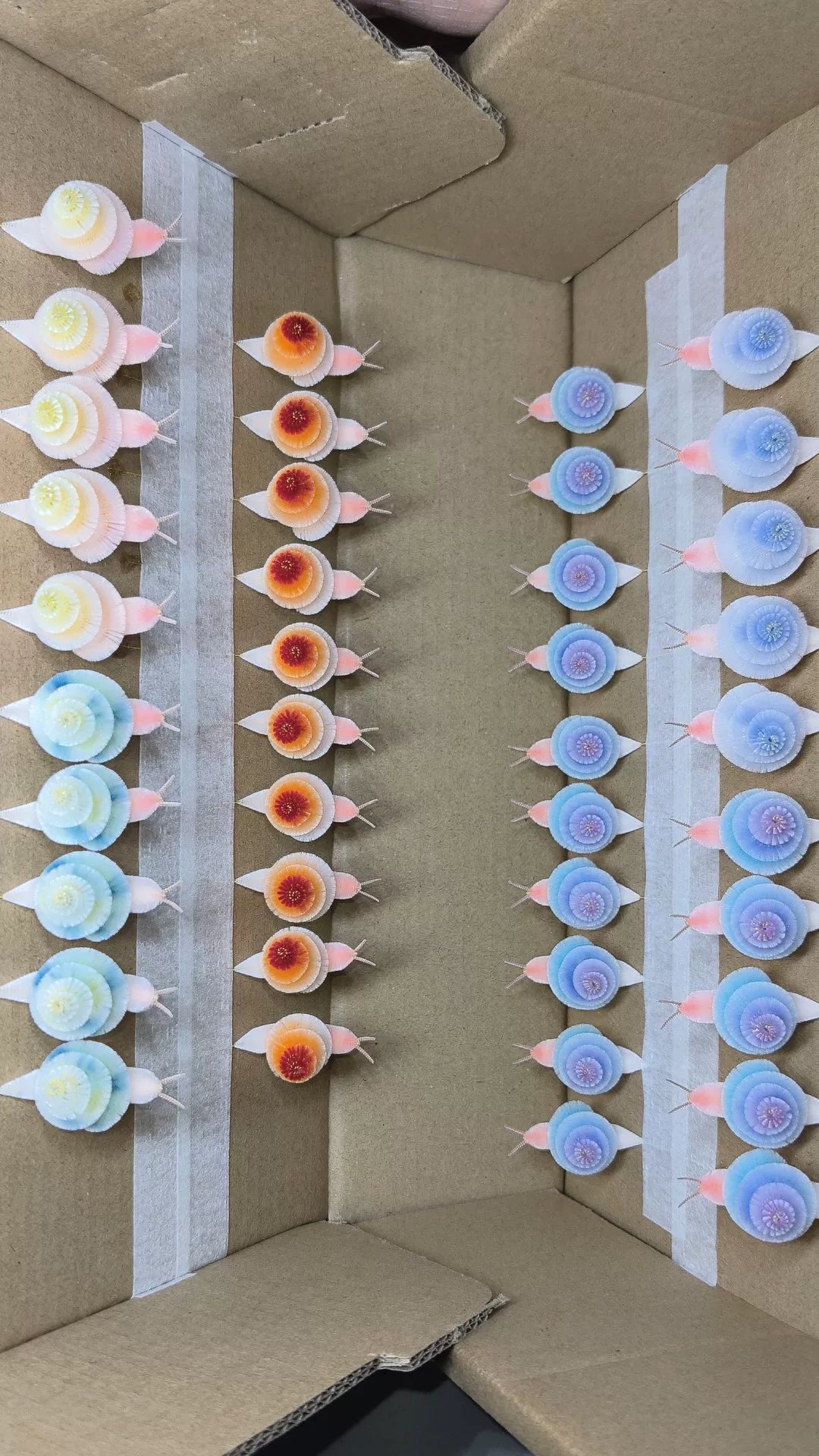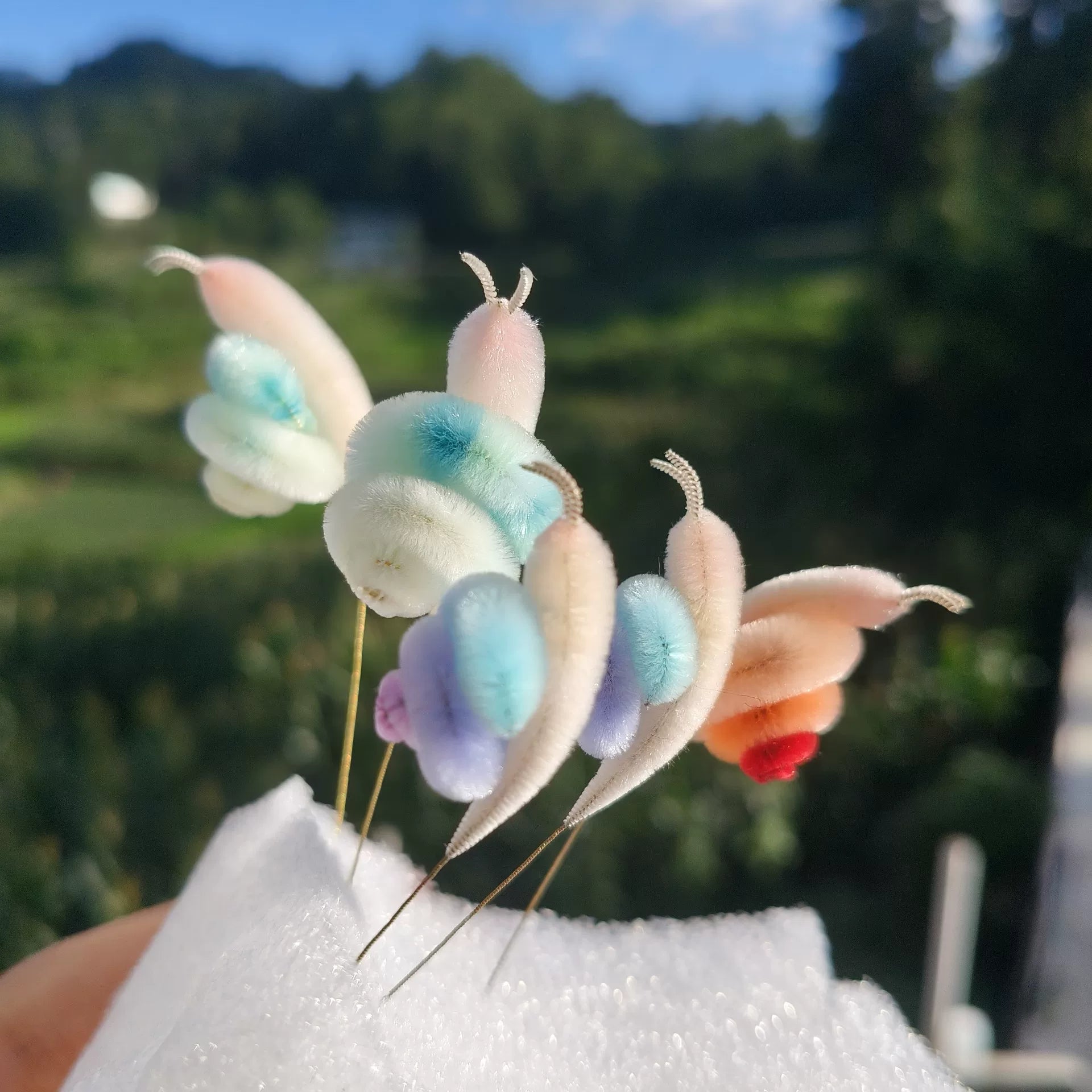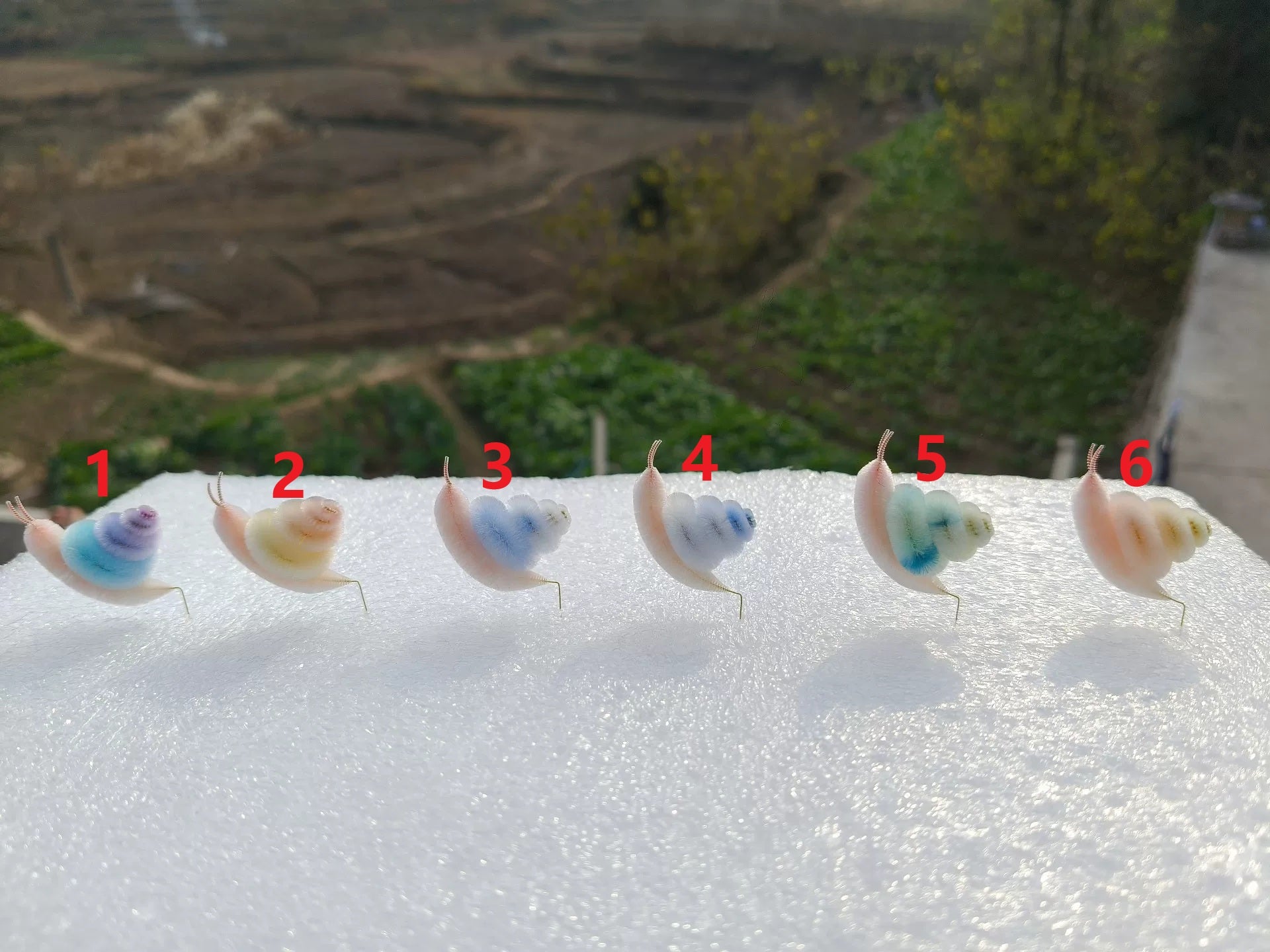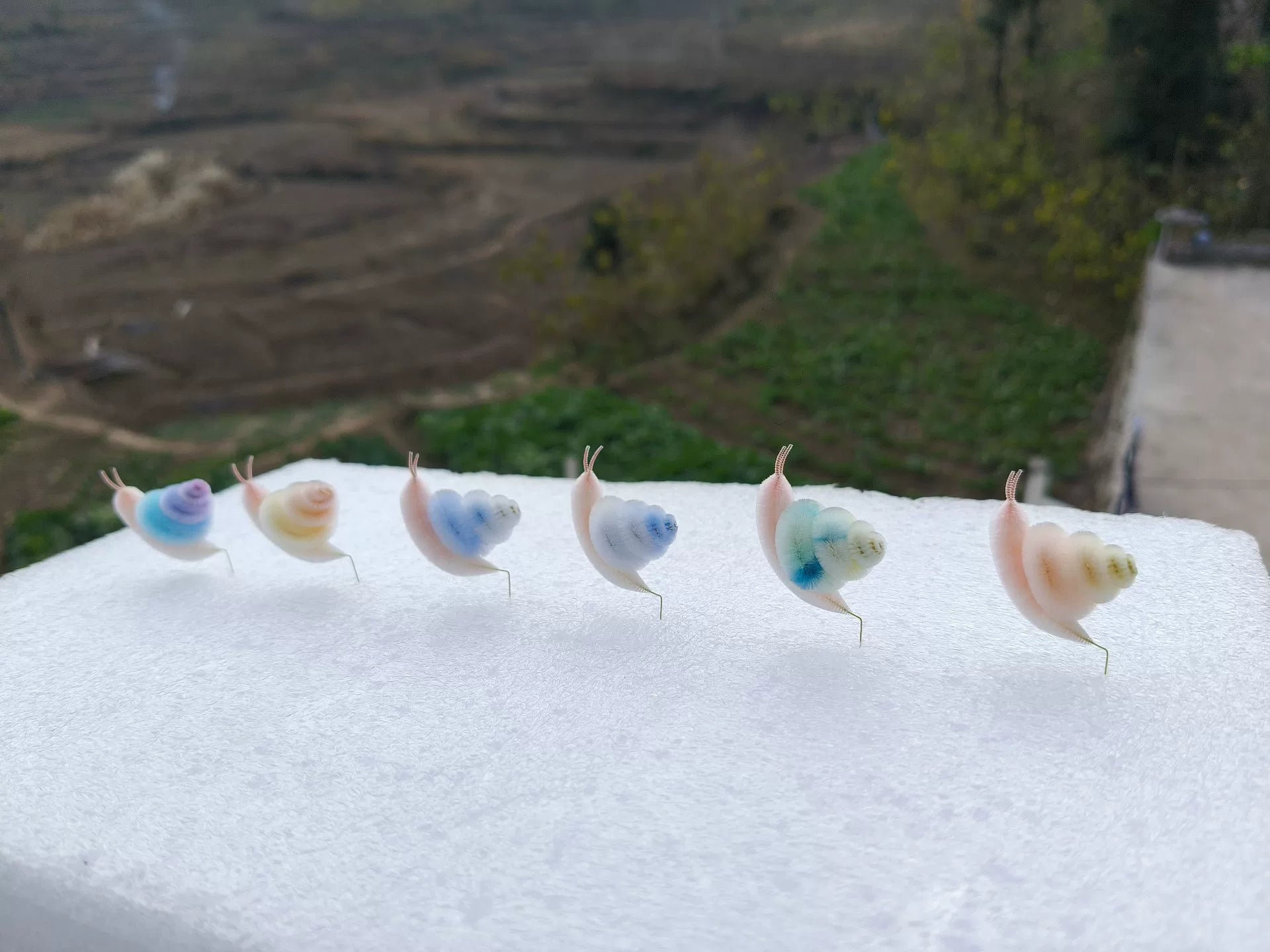 This cute snail is crafted by hand using the traditional Chinese Ronghua (velvet flower) technique. Made from natural mulberry silk threads, it features a soft, fluffy spiral shell in pastel gradient colors. Available in 7 color options.