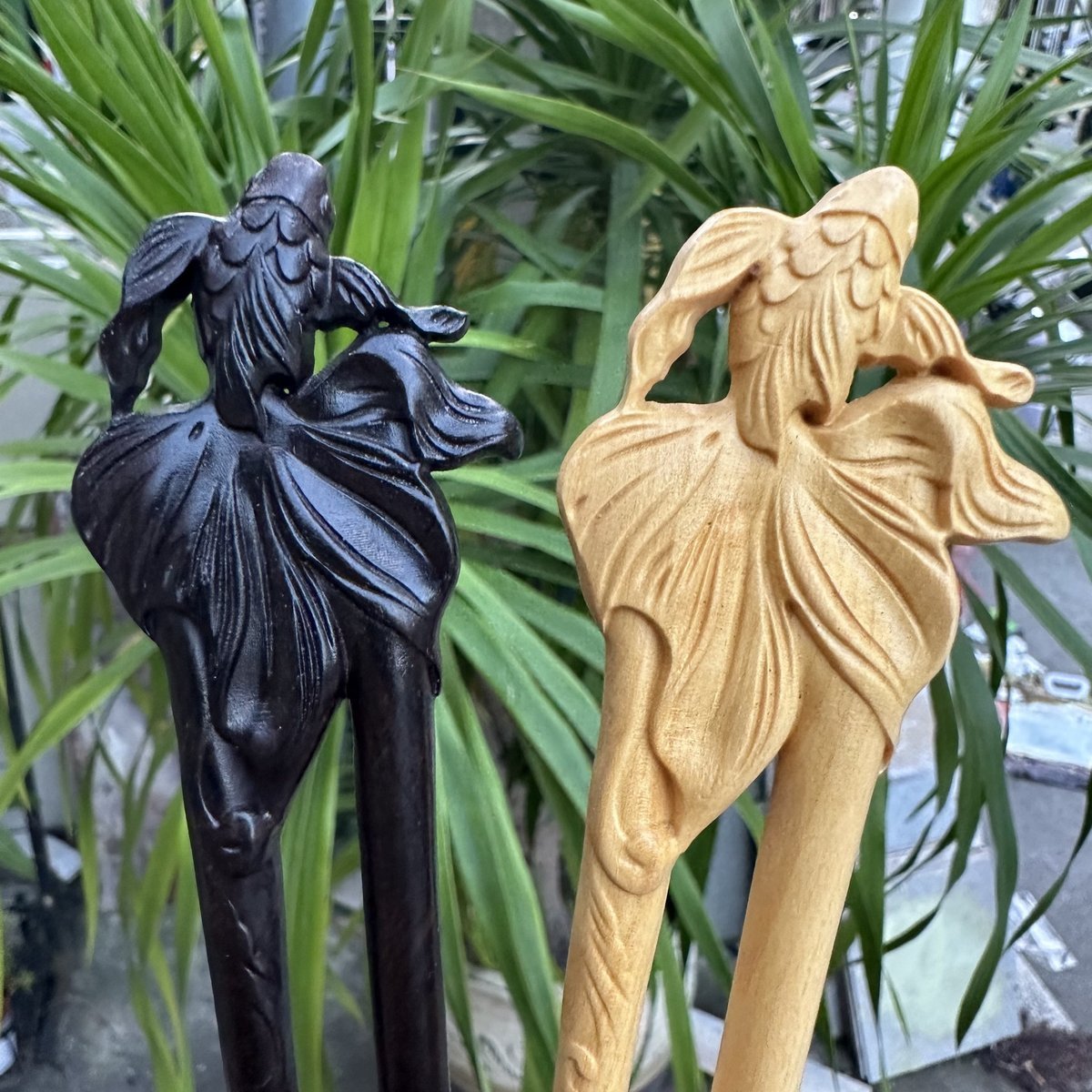 This set of two U-shape hair sticks is made from premium natural woods in their original authentic colors: boxwood (light warm beige) and African blackwood (rich dark shades). No dyes or coatings are applied — the natural tones and subtle grain patterns come directly from the wood, with finely sanded smooth surfaces that glide effortlessly through hair without pulling or damage.