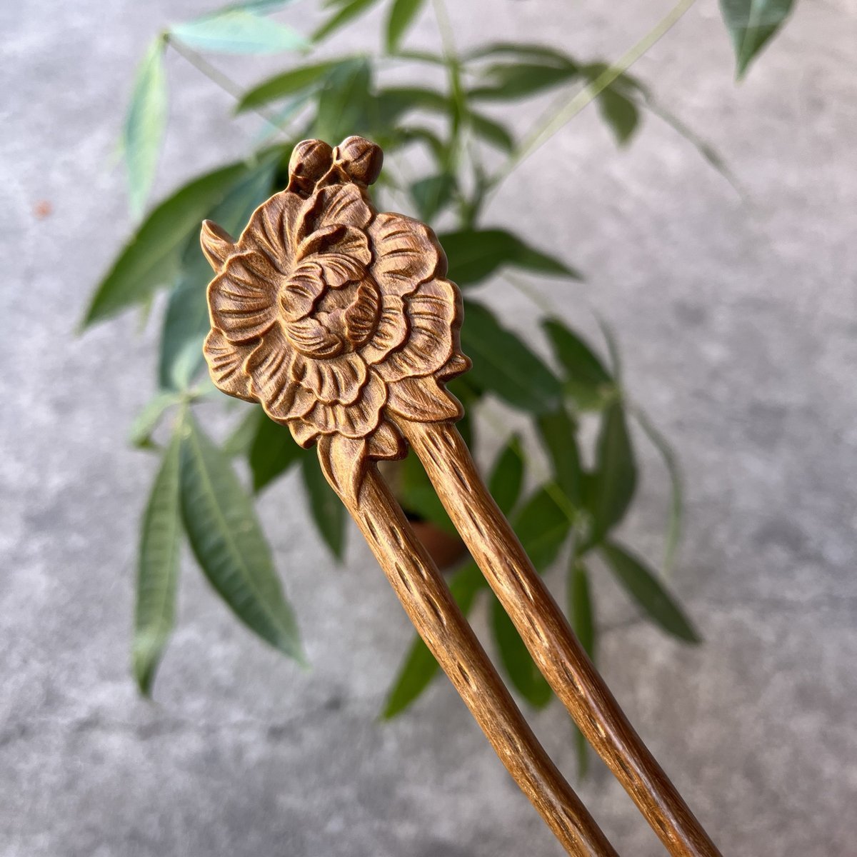 - Design: Classic U-shape (two-prong) hairpin featuring a detailed peony flower motif on the decorative top (visible from both sides)