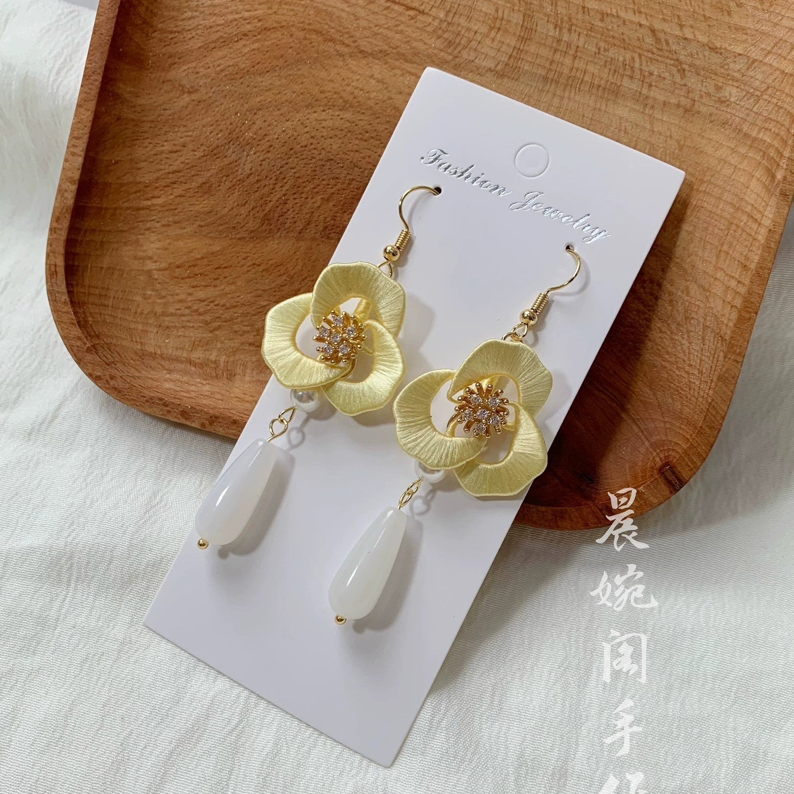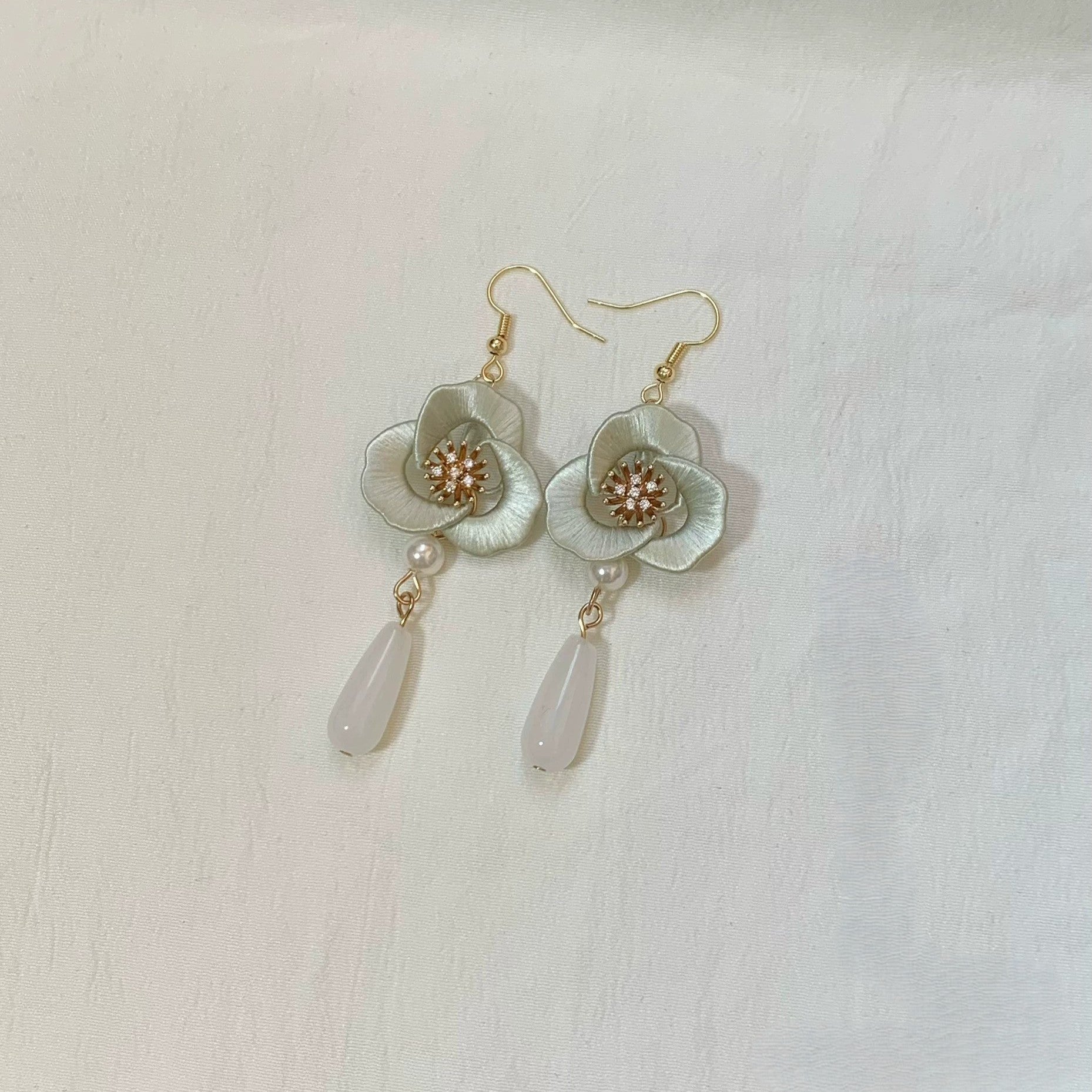Discover the delicate beauty of our handcrafted Chanhua Flower Drop Earrings, perfect for adding a touch of elegance to any occasion. Made with meticulous attention to detail, each earring features a gracefully sculpted flower in a soft, matte finish, centered with a sparkling, crystal-embellished accent. Dangling below is a smooth, teardrop-shaped white jade stone, offering a timeless and sophisticated look.