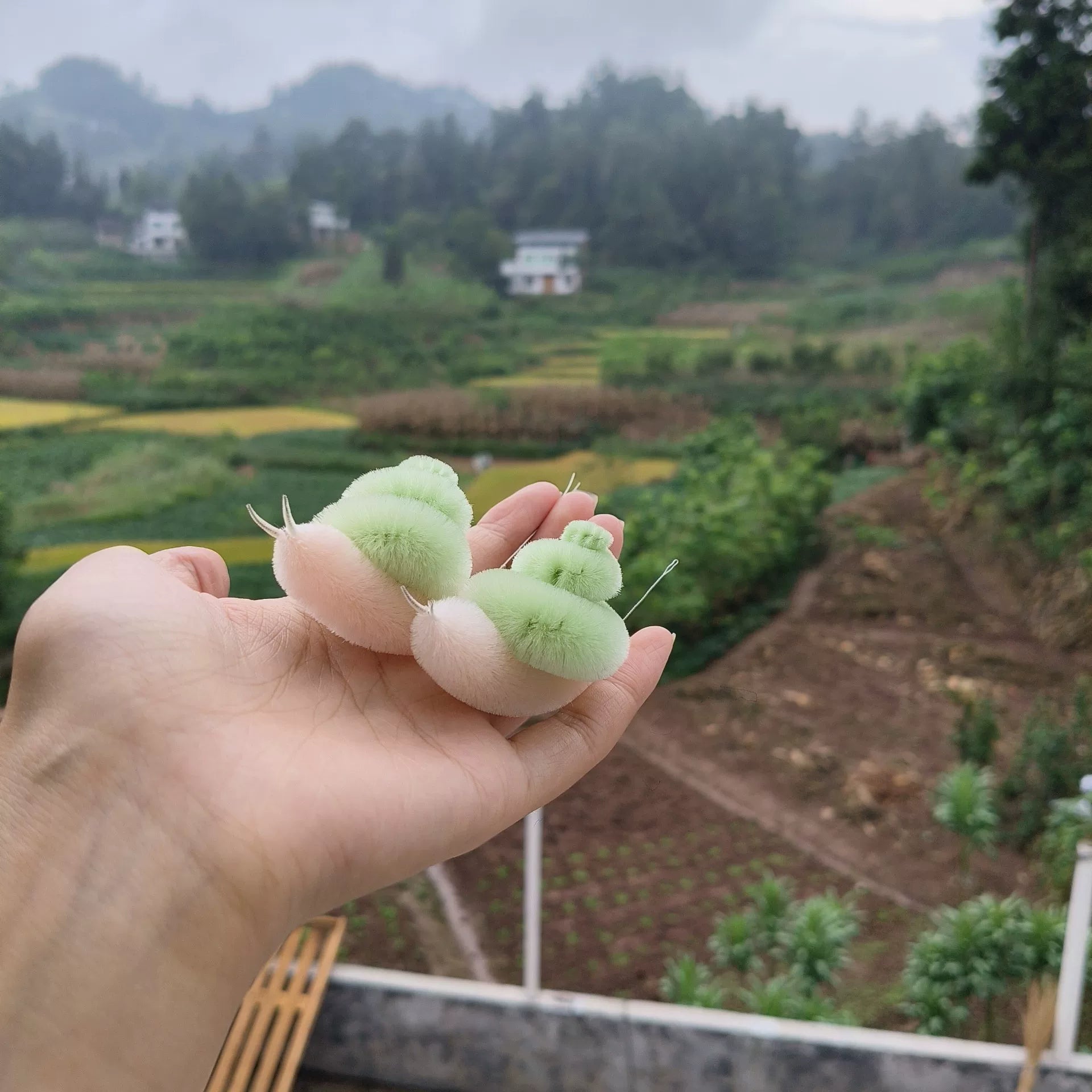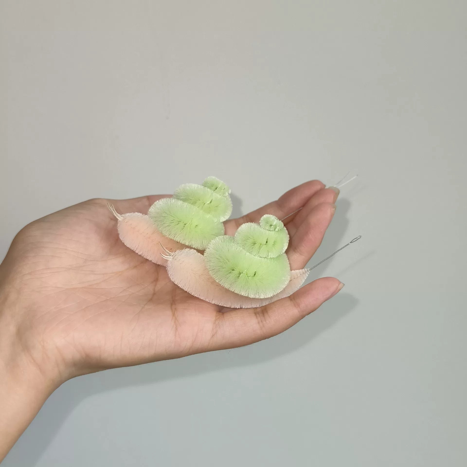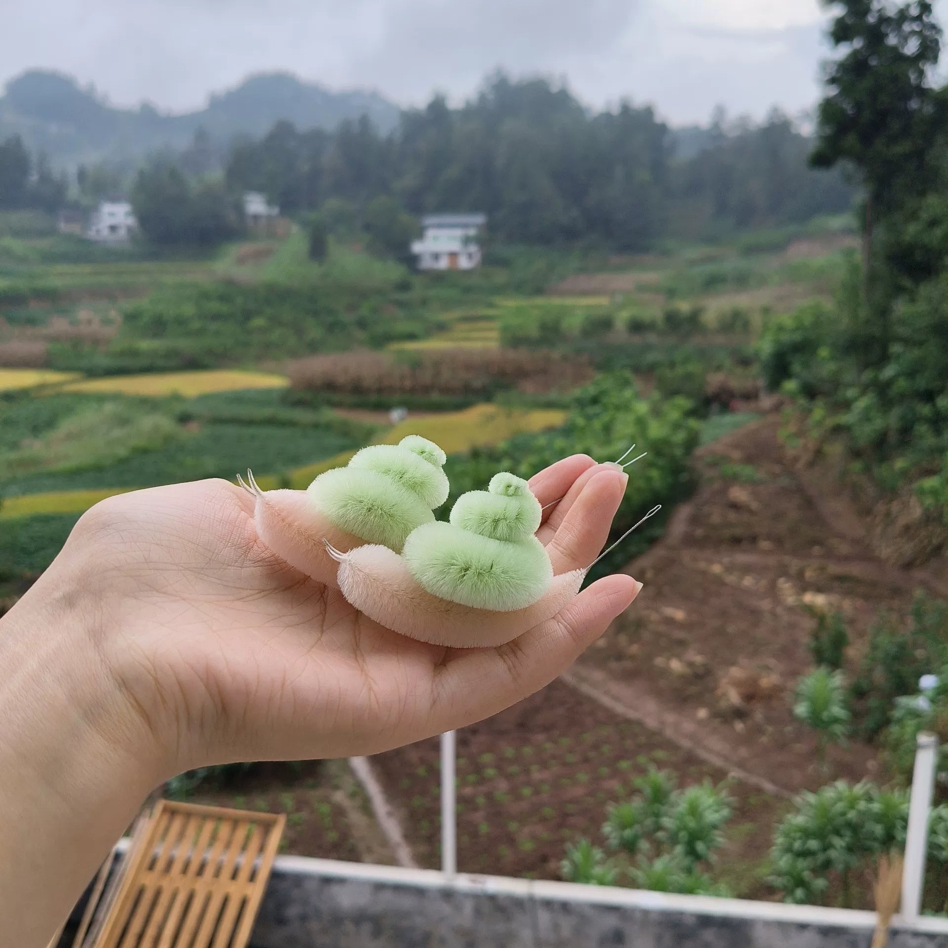 This display piece is crafted entirely by hand using the traditional Chinese Ronghua (velvet flower) technique. Made from natural mulberry silk threads, it features an adorable large snail with a fluffy spiral shell in soft mint green, pale pink body, and delicate antennae. The real product has superior fluffy texture and looks even better than the photos.