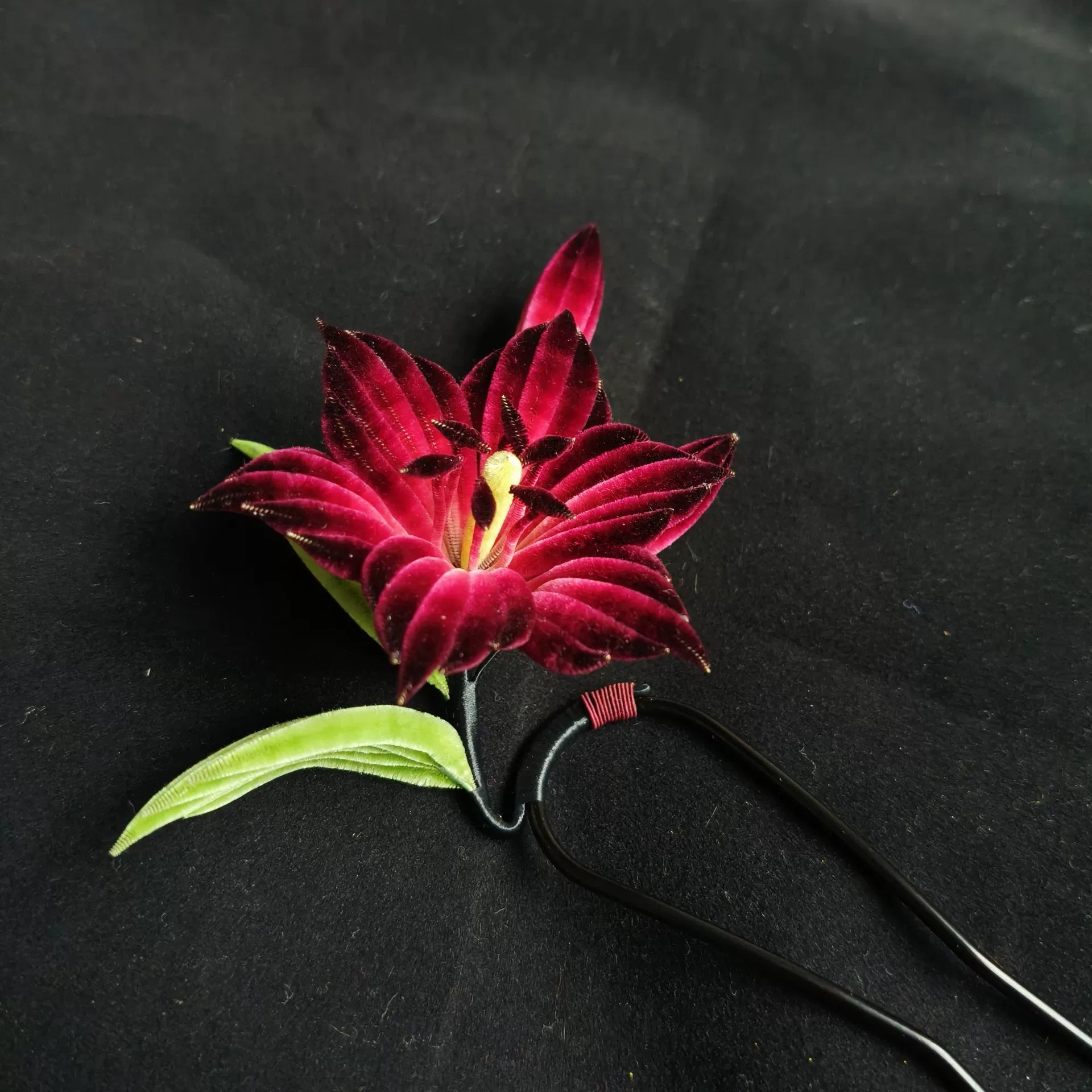 This hair pin is crafted entirely by hand using the traditional Chinese Ronghua (velvet flower) technique. Made from natural mulberry silk threads, it features a deep red lily flower with layered velvet petals, green leaves, and a subtle yellow center for realistic detail. Photos show the piece in different lighting; the real product has excellent texture and looks even better in person.