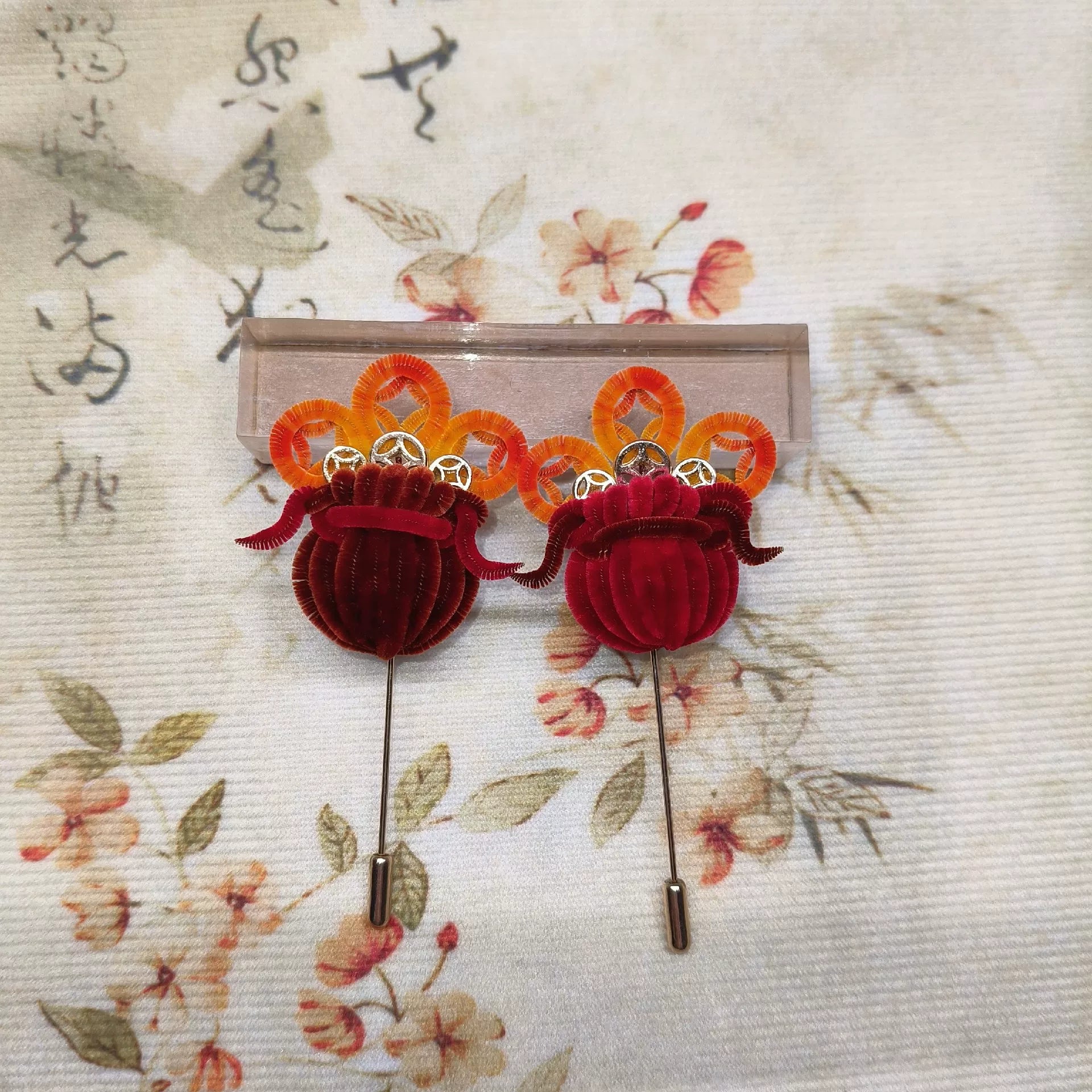 This brooch is handmade using the traditional Chinese Ronghua (velvet flower) technique. Crafted from natural mulberry silk threads, it features a rich red money bag (purse) design with orange looped accents and rings for detail. Ronghua symbolizes prosperity in Chinese tradition.