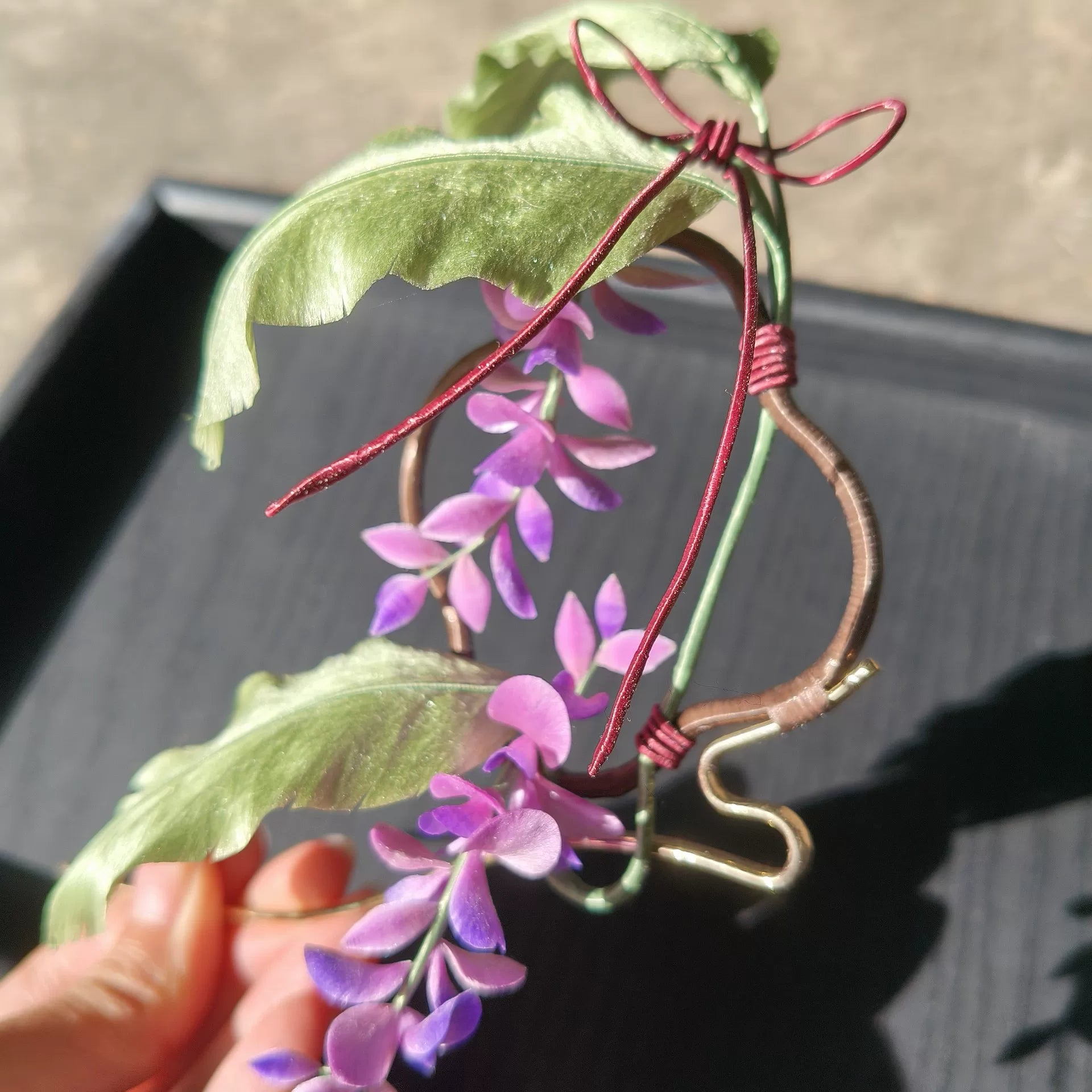 - Green velvet banana leaves framing cascading purple wisteria flowers, accented with silk-wrapped stems and ribbon details