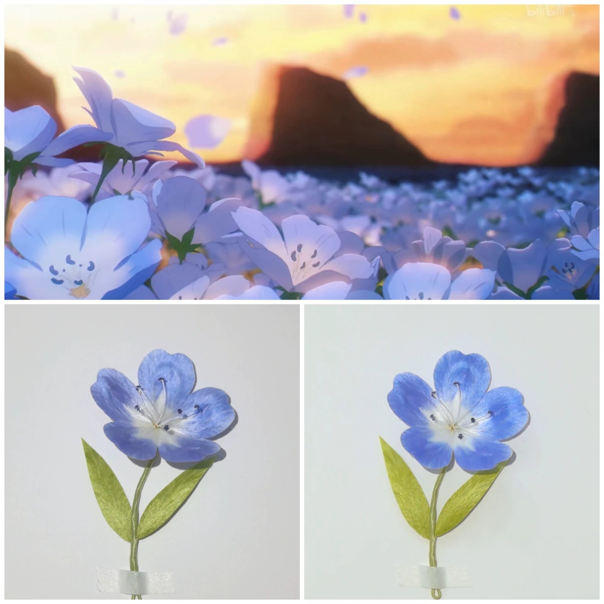 Authentic Ronghua (绒花) recreation of the blue “Soujourn Flower” (苍月草 / Soujourn Clematis) from the anime Frieren: Beyond Journey’s End – the flower Himmel brought back from his hometown. Entirely handcrafted by master artisan using the traditional Chinese Intangible Cultural Heritage velvet flower technique with natural mulberry silk thread.