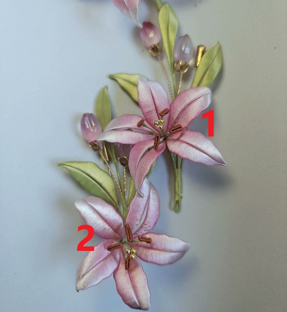 This exquisite brooch features a blooming pink lily, a symbol of purity and prosperity. Every petal and leaf is meticulously created by hand, wrapping thread by thread to achieve a sophisticated 3D effect. This traditional Chanhua technique provides a luxurious texture and a soft, silk-like luster that is even more beautiful in person than in photos. Each piece is a unique work of art, offering exceptional quality and a lifelike botanical depth.