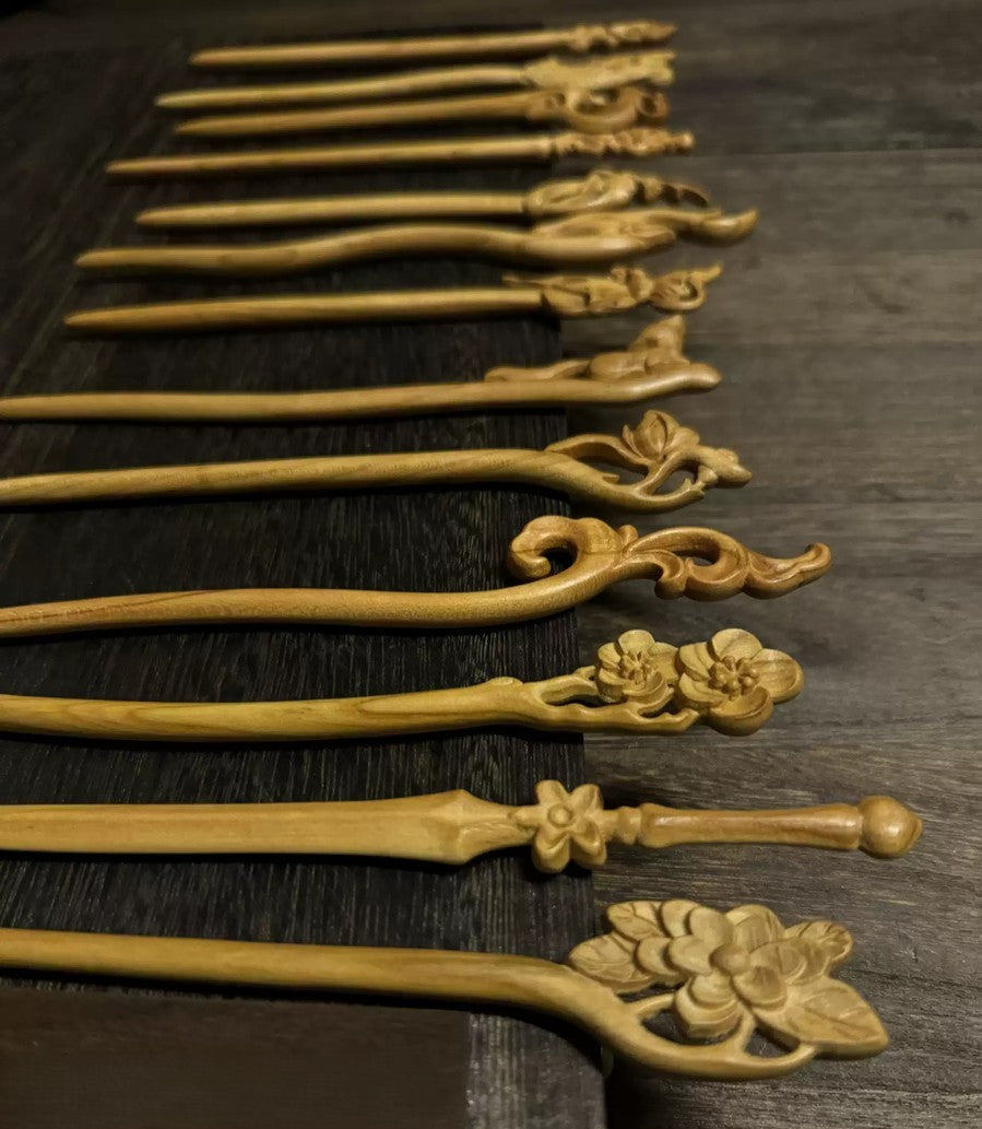 This set includes multiple hair sticks crafted from natural peach wood, valued for its light golden-brown tone and smooth texture. No dyes or coatings are applied—the warm color comes entirely from the wood's natural grain after fine polishing.
