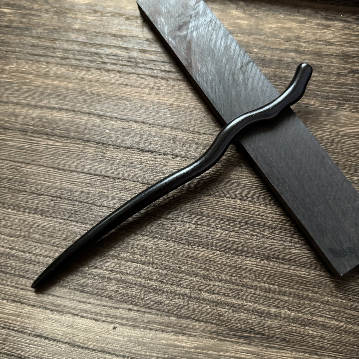 We start with 100% natural African Blackwood, a premium material known for its incredible durability, density, and deep, lustrous color. Every hairpin is carved and polished by hand to achieve a perfectly smooth finish that glides through hair without snagging. True to its natural form, no paints, stains, or lacquers are used, allowing the authentic beauty of the wood to shine through.