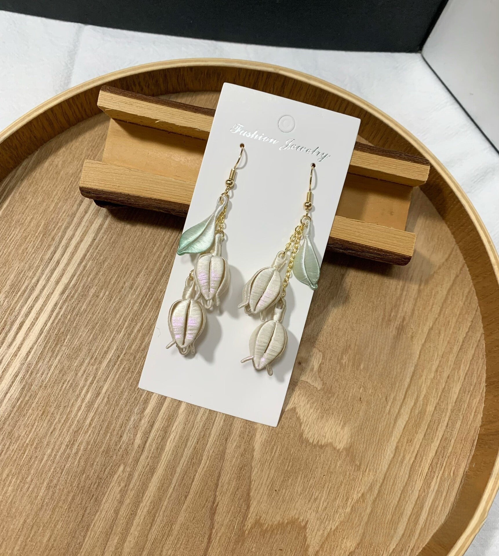 This handmade Chanhua earrings feature a lily of the valley design, crafted entirely by hand with threads wrapped one by one.
